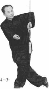 两臂顺时针划圆到上方,剑 尖朝下,两腿交叉立起(图 4-2); .