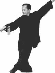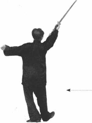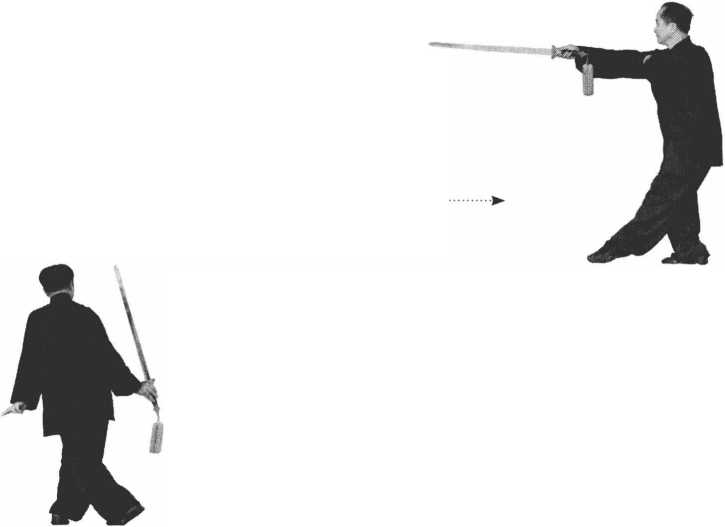 右手立剑对2号位斜下方 慢慢送出,左臂对6号位上 方,两臂成一条斜直线,右 腿下半蹲,左脚仍绷脚前 点地(图14一7)。