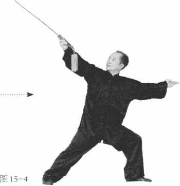左脚落向6号位,成左弓步, 两臂在身前斜打开,右手斜 撩剑对2号位上方,左手打 开到6号位下方,眼睛看剑 的方向(图15-4)。