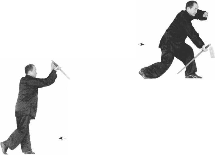重心移到左脚,上右脚成左踏 步,左手下垂,右手叼把向后划 弧成崩剑(图17-2);