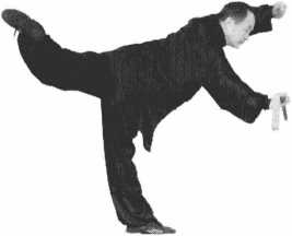 身体面对7号位,上右脚,左腿 屈膝后抬,上身向前下俯,右手 钳把握剑,剑的下刃对7号位平 推,左手托掌(图16-3)。