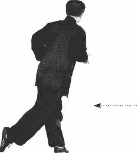 右腿下沉,落左脚,再向前上右脚,同 时右手也慢慢地降到身前,重心移到右 脚,向右转身到面对正前成左踏步(图