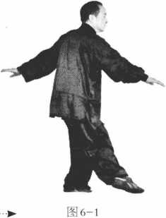 右手由下打开到旁,左手从左 托掌下到左旁,做右踏步翻身, 翻完后成左踏步(图6-5 )。