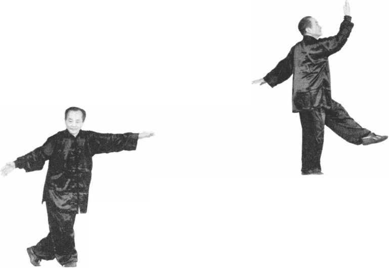 右腿直立,左腿直抬25度,左 手仍下垂,右手手背朝外,向7 号位斜上方撩出(图6-2 ); ■?…右腿直立,左腿直抬25度,左 手仍下垂,右手手背朝外,向7 号位斜上方撩出(图6-2 ); ■?…右腿下沉,落左脚,再向前上右脚,同 时右手也慢慢地降到身前,重心移到右 脚,向右转身到面对正前成左踏步(图右腿下沉,落左脚,再向前上右脚,同 时右手也慢慢地降到身前,重心移到右 脚,向右转身到面对正前成左踏步(图6—3 );6—3 );图6-2图6-2图6—3图6—3右手由下打开到旁,左手从左 托掌下到左旁,做右踏步翻身, 翻完后成左踏步(图6-5 )。右手由下打开到旁,左手从左 托掌下到左旁,做右踏步翻身, 翻完后成左踏步(图6-5 )。图6—4图6—4