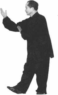 右手划到右身旁,左手手 心照面,左弓步,上身往 左靠(图10-4);