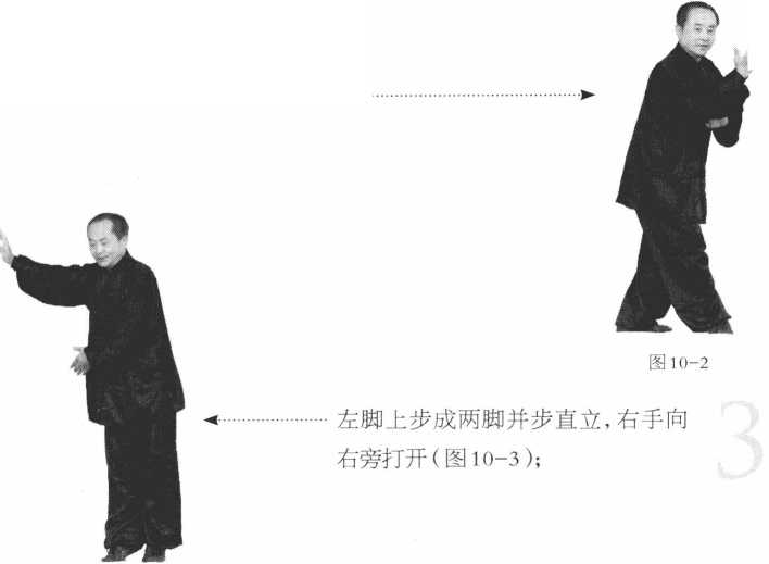 右脚起步,向右后三步走一个 小圈,走到面对8号位成左踏 步,腰略往右拧(图10-2); .....右脚起步,向右后三步走一个 小圈,走到面对8号位成左踏 步,腰略往右拧(图10-2); .....图 10-3图 10-3