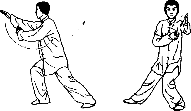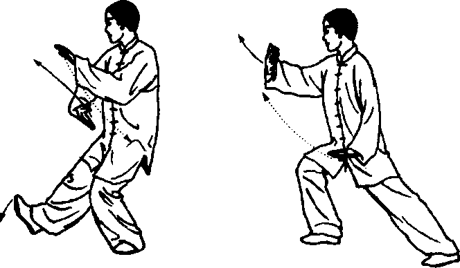 身法:上体左转,胸向西南,重心先后移再前移。