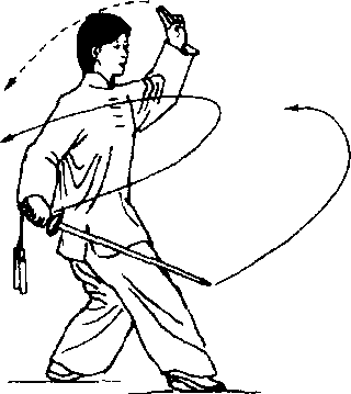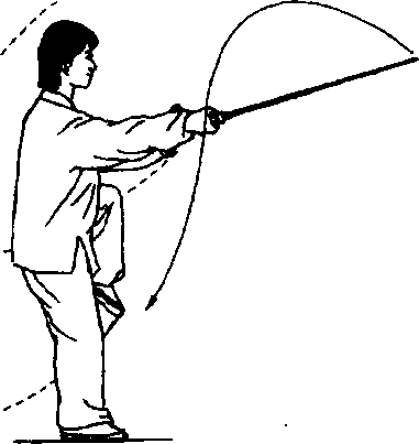 2. 右手握剑随身体左转,边外旋边划弧向左摆抽经面前(手心 向里),剑尖向右,再内旋经体前向右、向下斜截。右手剑指在划 弧过程中,边旋转边绕行。