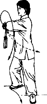 2. 重心前移时,左腿屈膝,右脚慢慢前收,两腿不要马上 直立。两腿慢慢直立与右剑指冉冉下落协调一致。