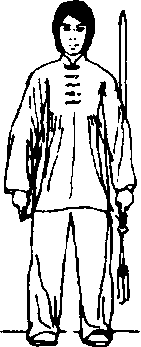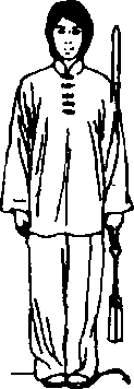 剑法:右剑指松开变掌,手心向里,自然垂于身 体右侧;左手持剑仍自然垂于左侧,两肩 松沉,全身放松。
