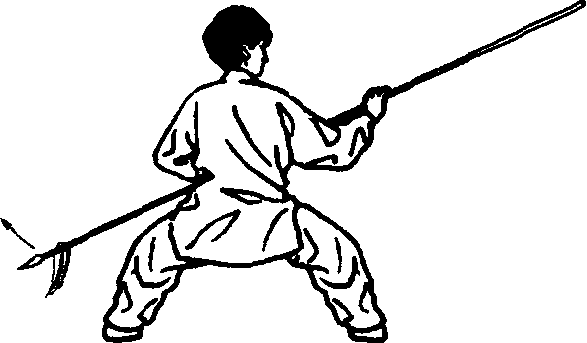枪法:随身体左转,左手握枪向下、向体左侧划弧至左腰间,手心 向上;同时,右手握枪向上、向体右侧划弧。两手使枪把从 .上向下劈,把端与肩同高。