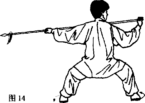 [动作:提膝拉枪](图16、17) 身法:重心先移向左腿,再移向右脚。上体左转。胸向西偏南。