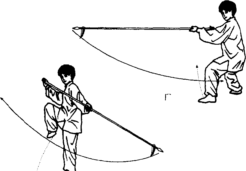 抽、托、滑、扎要协调连贯。扎枪时,右腿脚跟外展、伸膝, 转腰,伸臂扎枪要节节贯通,使劲贯枪尖。同时要注意右臂外旋使 枪身旋转着扎出。