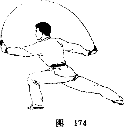 1 ,两掌推地,右腿跪地,身躯抬起,左脚随之从南方向 西方挪步(图173)孑2,上动未停,右脚脚底着地,身躯向前 移动,左腿屈膝半蹲,右腮挺膝伸直,成左弓箭步$与此同 时,左掌向前撩起直臂平举,掌指朝上,小指外侧朝前;右 掌向后撩起反臂斜举,五指撮拢成勾手,勾尖朝上,眼视左 掌前方(图174)。要点:与第三段第一动的弓步撩掌相同。