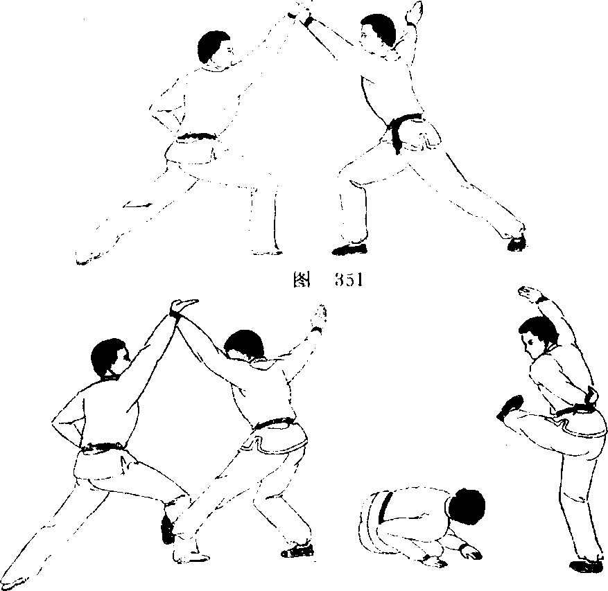 1.乙方,左拳变掌,从左腰侧向甲方右手腕部挑打,右 掌随之挣脱(图351)。2.上动未停,乙方左脚脚尖翅起, 向甲方右小腿下端的外侧踢摆勾挂(图352)。3.上动未停, 乙方将甲方右腿勾挂踢起,左掌同时将甲方右手臂外拨,摆 至身后成勾手反臂斜举,勾尖朝上;右掌则举向北方,眼视 中方。甲方在乙方上拨下勾连合用力之下即被摔跌扑倒地, 做外批盟跌扑动作(图353) 0