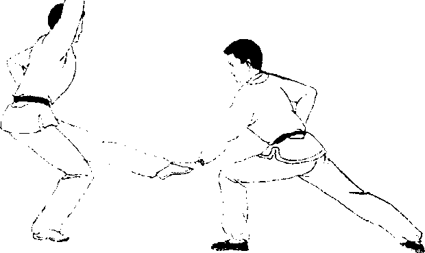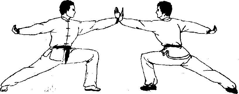 乙方,在甲方被摔倒地站起的时候,左脚向正西方向落 步,左腮屈膝,右腿伸直,成左弓箭步,左勾手同时变掌, 痛时经左腰侧向甲方头部眉间直臂推击伸出,掌指朝上,右 掌随之从上向前(西方)、向下、向后直臂瓠形绕环,至身 用成勾手反臂骐举,勾尖朝上;眼视甲方。甲方,被摔倒地 后即用右腿跪地站起,当乙方推掌击头时右脚后移,右腿伸 宜,左腿屈底,成左弓箭步,左掌直臂向上撩起,格挡乙方 左掌,掌指朝上,右手随之向身后反臂斜举成勾手,勾尖朝 上,眼视乙方(图354)。