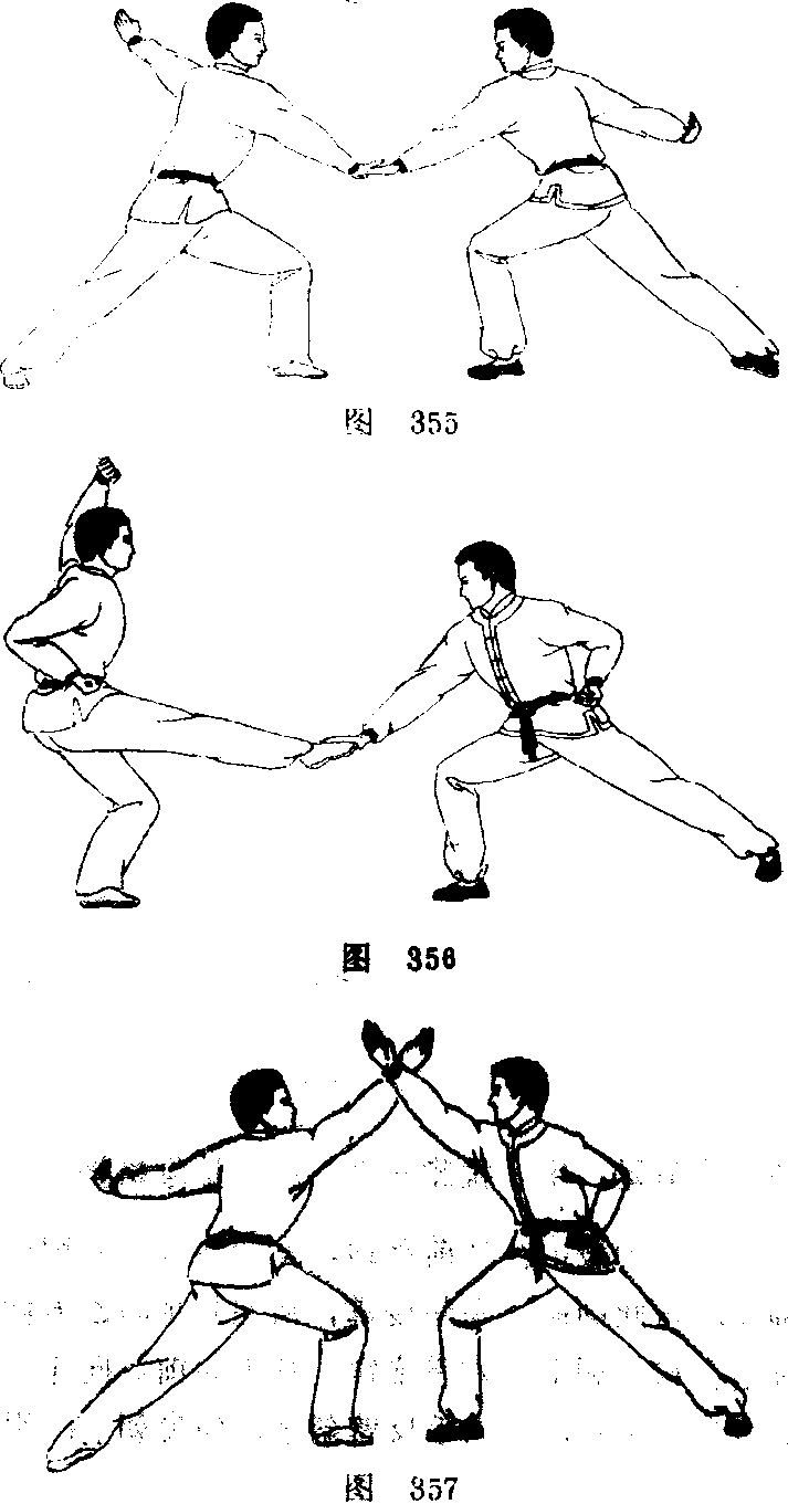 】,甲方,右勾手变掌i臂外旋便掌心朝上.从后向上、 向前、向乙方左掌掌背拍击,打开乙方的左掌,左掌则随之 从前向下、向左后摆起;眼视乙方(图355) 0 2,上动未停, 甲方左掌变拳,屈肘横架于头前上方,拳眼朝下:右掌变 拳,从前向下、向里、向上、向前祖用挽臂绕环,至身前时 收抱于右腰侧,拳心朝上$与此同时,右脚向乙方左腿膝前 弹踢,脚面绷平,眼视乙方。乙方,在甲方踢膝时左脚向后 退步撤离,躲开甲方的踢击,左腿伸直,右腿屈膝$在退步 的同时,右勾手变掌,臂外旋使掌心朝上,从后向上、向 前、向下拍击甲方右脚脚面j左掌则变拳,屈肘收抱于左腰 侧,拳心朝上j眼视右掌(图356) 0 3.上动未停,甲方, 右被脚击在身前落地,右腿屈膝,左腿伸直,成右弓箭步, 与此同时,右拳变掌,从右腰侧向乙方脸面直臂推击伸出, 掌指朝上;左拳变掌,从上向前、向下、向后直臂瓠形绕 坏,至身后成勾手反臂斜举,勾尖朝上:眼视乙方脸面。乙 方,在甲方推掌击脸的同时,右掌向上直臂撩起格挡甲方的 右掌臂,眼视甲方(图357) o 4,甲方,左勾手变掌,臂外 旋使掌心朝上,从后向上、向前、向乙方右掌掌背拍击,打 开乙方的右掌,右掌则随之从前向下、向右后摆起(图358)。