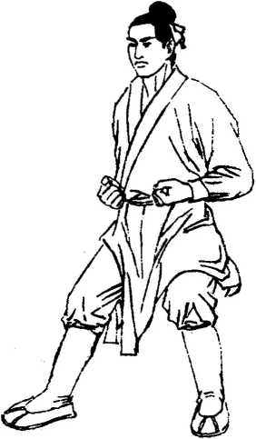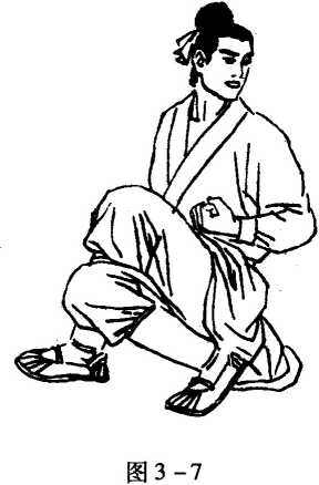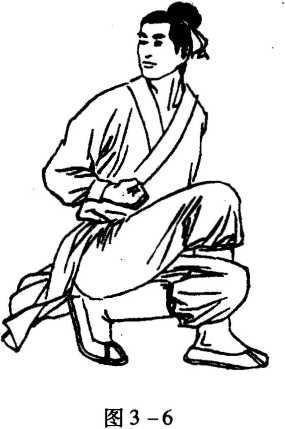 图说武派功夫真传半蹲之脚尖外撇,再把左腿虚点地。图3-5右虚步须分开腿,右腿在后左在前。 且教左膝半屈蹲,再把右脚虚点地。左歇步须交叉腿,左腿在后右在前。 且教两膝全弯屈,臀部稳坐左脚跟。桩基功第三右歇步精租秘说之七