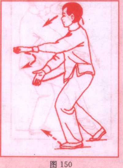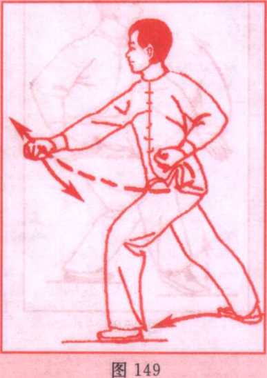上体左转,重心前移成左弓步,左掌随体转变拳收于左腰 侧,拳心向上。右拳顺势向前方撩打,拳高与腹平,拳心向下。 眼看右拳。(图149)