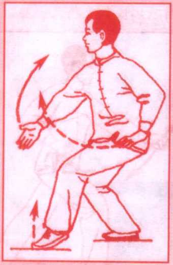 上体微右转,重心后移至右脚,提起左脚,脚尖下垂。右掌 上挑于体前,腕与肩平,掌心向左。左掌向前向上,翘腕侧掌于 右腕内侧稍下。眼看右掌。(图153)