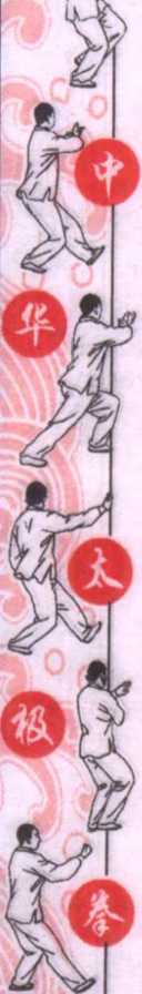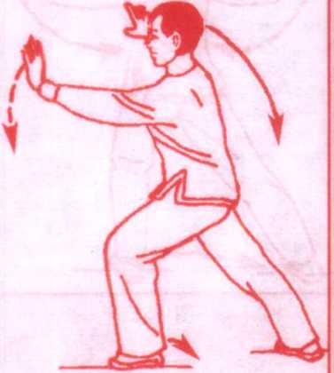 重心后移,左脚尖外展,上体继续左转,重心再前移左脚;两 前臂外旋,右掌心向左并向左划弧至右胸前。左掌心向上,并向
