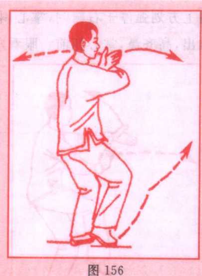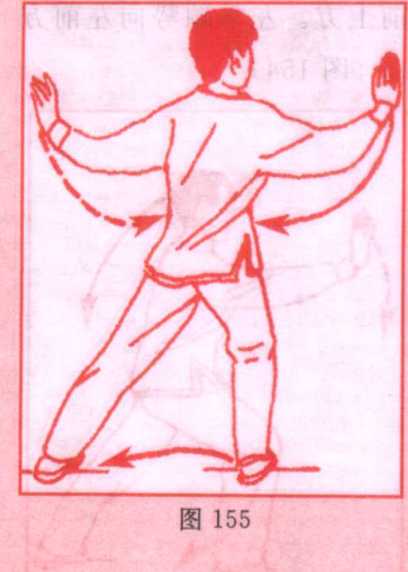 上体右转,左脚尖内扣,重心移至右脚,右膝半屈;两掌向体 侧划弧,两臂平举,掌心向外。眼看右前方。(图155)