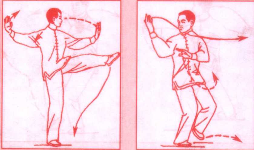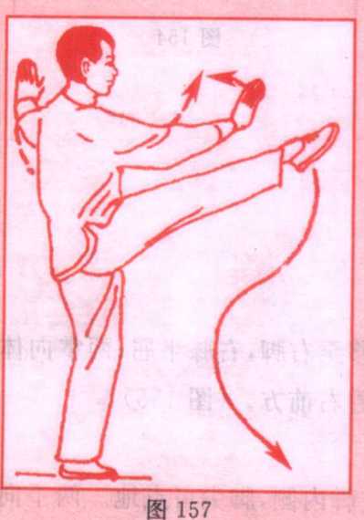 重心移至左脚,将右脚收于左脚内侧,脚尖可点地。两手向 下、向体前划弧,使双掌交叉于胸前,掌心均向内,左掌在内。随 后,右膝上提,右脚向右前方缓慢蹬踢,腿蹬直,脚面平;两掌同 时向右前和左后方划弧分撑,掌心向外,腕与肩平。右臂、腿上 下平行。眼看右掌。(图156.157)