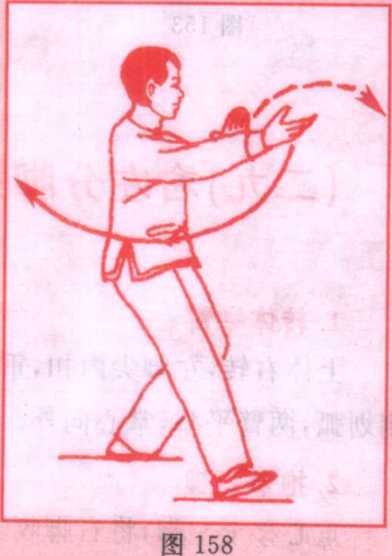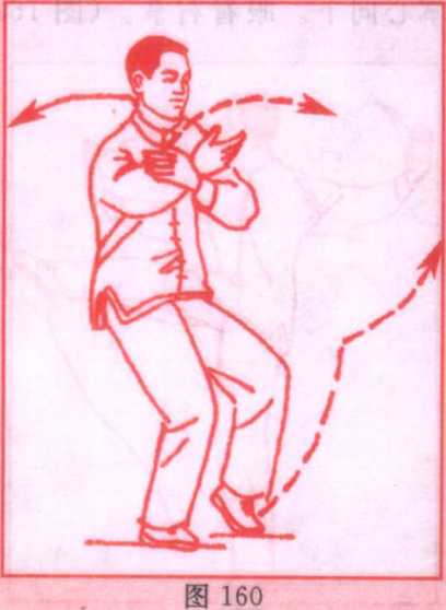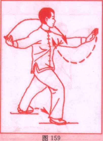 左掌从右前臂上方穿出后,重心前移至右脚。右掌向下、 向右后划弧,掌心向上;左掌向前偏左划弧,掌心斜向前,两臂 平举于体侧,肘微屈。眼看左掌。(图159)