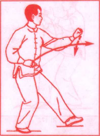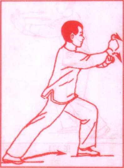 重心后移,右脚尖上翘外展。左掌翻转掌心向上,左肘微屈 后收。右臂向内上划弧,使右掌附于左前臂内侧;随后,重心前 移成右弓步。右掌从左前臂上方向前穿出,掌心斜向前,左臂屈 肘内收至腹前。眼看右掌。(图167.168)