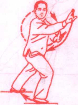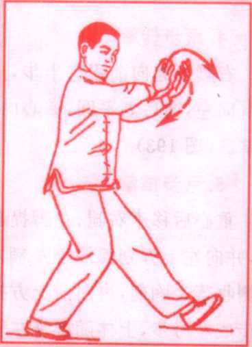 体前向内靠拢,左前臂内旋,掌心转向内。右臂稍屈肘回收,右