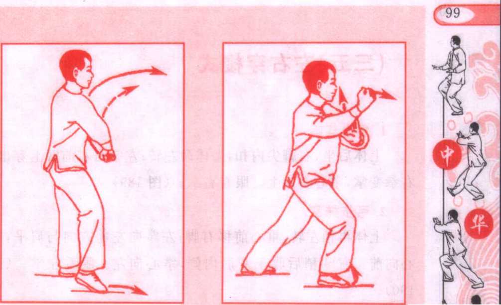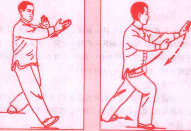 68 图68 图右脚尖内扣,重心移右脚,左脚向身后撤步成右弓步;左前 臂外转,掌心向上并向右,向内划弧收于腹前,同时,右前臂内 转,掌心向下,经左前臂上方向前推出,腕平肩,掌心向前。眼看 右掌。(图186)