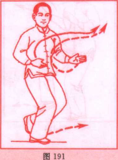 上体再稍左转,重心前移右脚;左掌向左前方向与肩平,掌 心向前。右掌稍后收于左肘内侧,掌心向左。眼看左掌。(图 190)