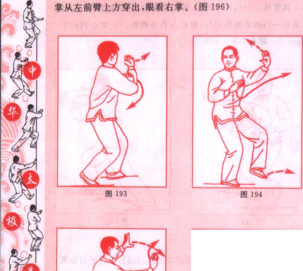 侧。眼看右前方。随后,左脚向左前方迈步,重心前移成左弓 步,上体左转;同时,两掌划弧上提至胸前、右掌指附于左腕内 侧,双掌一同随势先稍向右,再向左前方推出。左掌心斜向上, 腕与肩平。眼看左掌。(图191.192)
