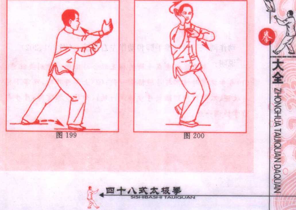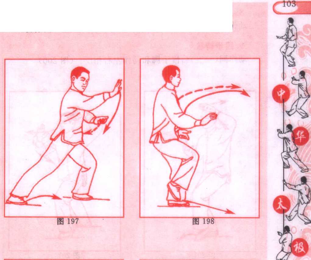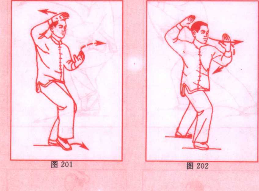 动作同(三五)2,惟手脚和动作左右相反。(图197)8 .上步捋推动作同(三五)3,惟手脚和动作左右相反。(图198.199)9. 跟步转掌动作同(三五)4,惟手脚和动作左右相反。(图200)10.弓步推掌动作同(三五)5,惟手脚和动作左右相反。(图201.202)说明:左右穿梭重在手廊的相互配合与协调。特别要注意: (1)弓步抹掌时抹掌与弓腿协调一致;(2)上步捋推时,双掌下捋 与收腿、双掌前推划弧与弓步协调一致;(3)弓步推掌时,弓步与 推掌协调一致。