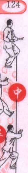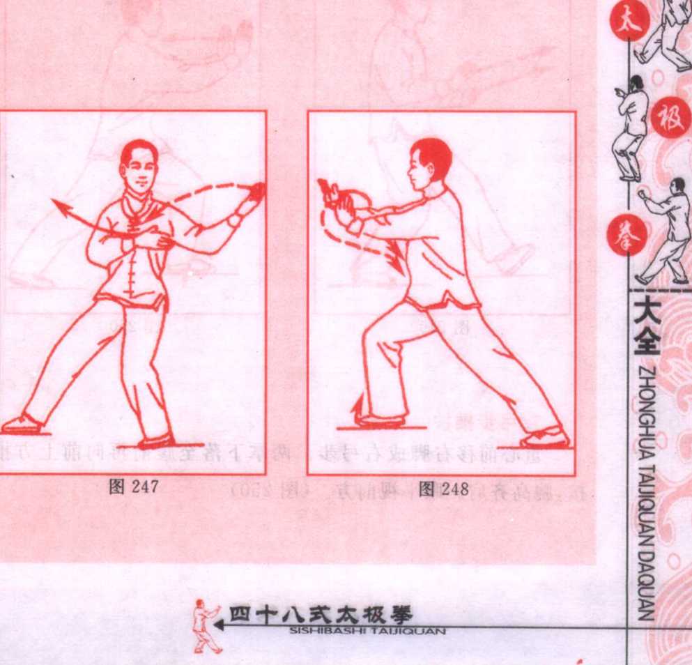 上体右转,右脚向前上步成右弓步;同时,右前臂向前上方 搠出,高与肩平,掌心向内。左掌向下按于左胯侧。眼看右掌。 (图 245)