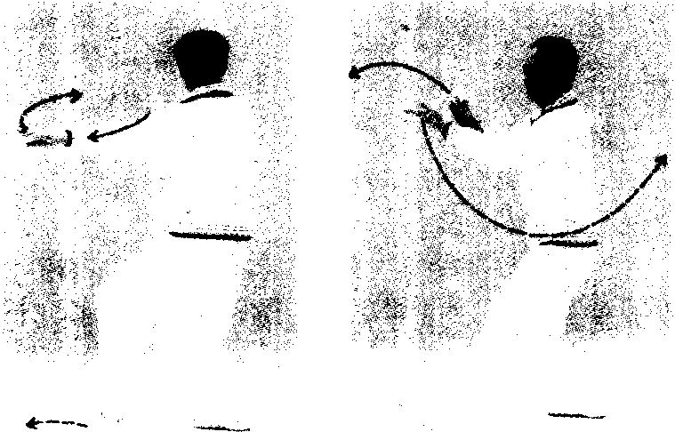 (2) 蹬脚前两掌先平圆划弧摆动,穿掌后两掌变立圆分 摆合抱。前后衔接应圆活连贯,并与腰部旋转协调配合。