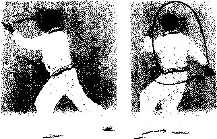 (1) 转体弓腿时,左脚尖尽量外展,右脚尖尽量内扣。 右脚上步时,合胯屈膝,提落轻稳。定势时,屈腿落胯,沉 肩坠肘,上体舒拔。
