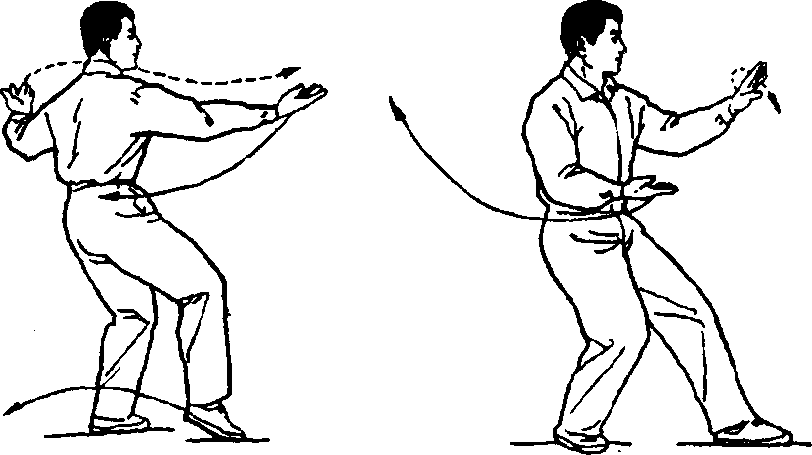 掌,掌心向上,由前经右 胯侧向后划弧平举,肘 部微屈,随之左臂外旋, 掌心翻向上;左脚轻轻 提起。眼随转体先向右