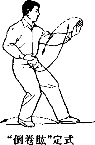 设对方用右手紧握我左手腕或小臂,我则左臂外旋仰掌、沉肘、 缩胯向后撤左步?带其前扑,趁势我以右掌还击对方面部或胸。此为 倒卷肱。(左右四个倒卷肱其用法相同,唯左右相反)
