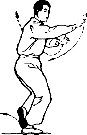 右脚向左前方盖步落下, 左脚在右脚落地之际随即提 起;同时两掌一齐向右平摆, 掌心均向下。眼看右掌。左脚向左侧(正北)落步, 右腿蹬直成左弓步(向北);两 掌随左转体经腹前向下、向左 划弧,边划弧边握拳。眼看左