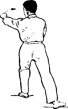 平贯,停于左额前,掌心斜向 外,右拳向左平贯,停于左肋 前,拳心斜向下,松腰、松胯。 眼转看右前方(正东)。