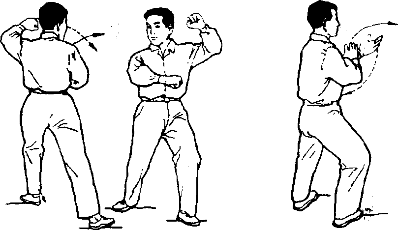 上式不停,左拳向右屈时 上体右转;同时两拳变掌,左