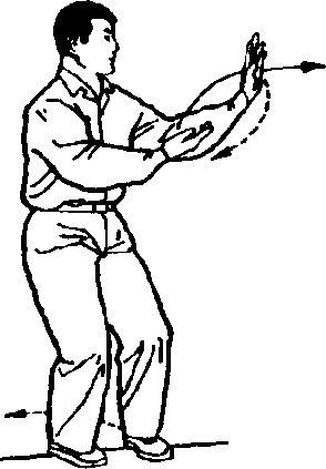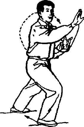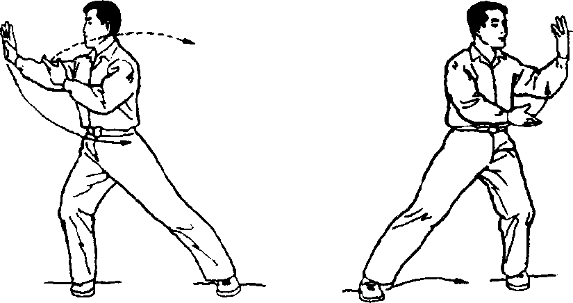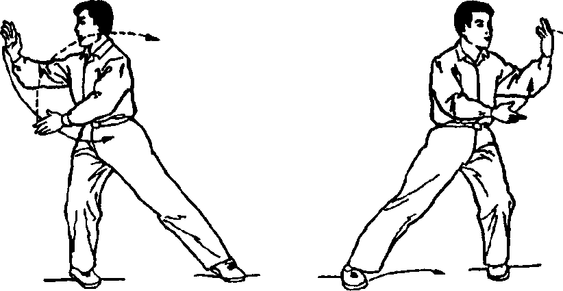重心后移,左脚尖内扣,上 体右转,右掌自左向右经面前 划弧,掌心向外;左掌自左经腹 前向右划弧,掌心由外转向内。 上体及视线随右掌转动。