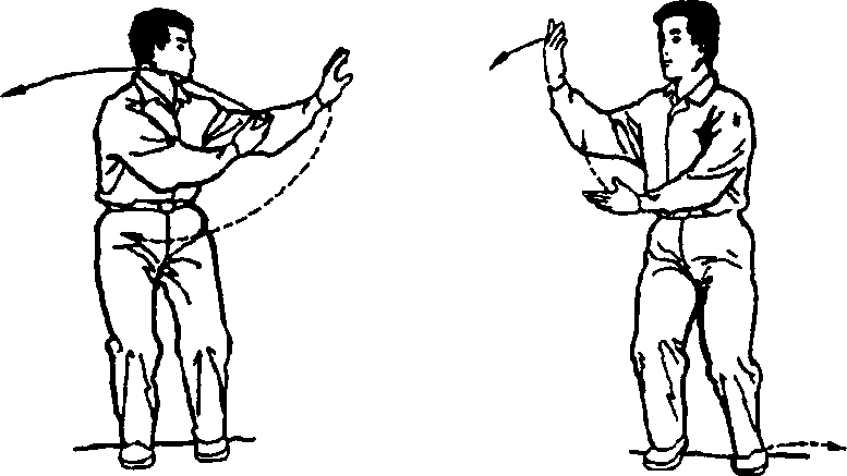 重心后移,左脚尖内扣,上 体右转,右掌自左向右经面前 划弧,掌心向外;左掌自左经腹 前向右划弧,掌心由外转向内。 上体及视线随右掌转动。上体左转,重心移至左 腿,右脚收于左脚内侧落地, 两脚相距10?20厘米,脚尖 皆向前手同时左掌掌心向内, 向上自右经面前向左划弧云 转,掌心由内转向外,右掌向 下经腹前向左划弧云转至左 肘内侧,上体及视线均随左 掌转动。