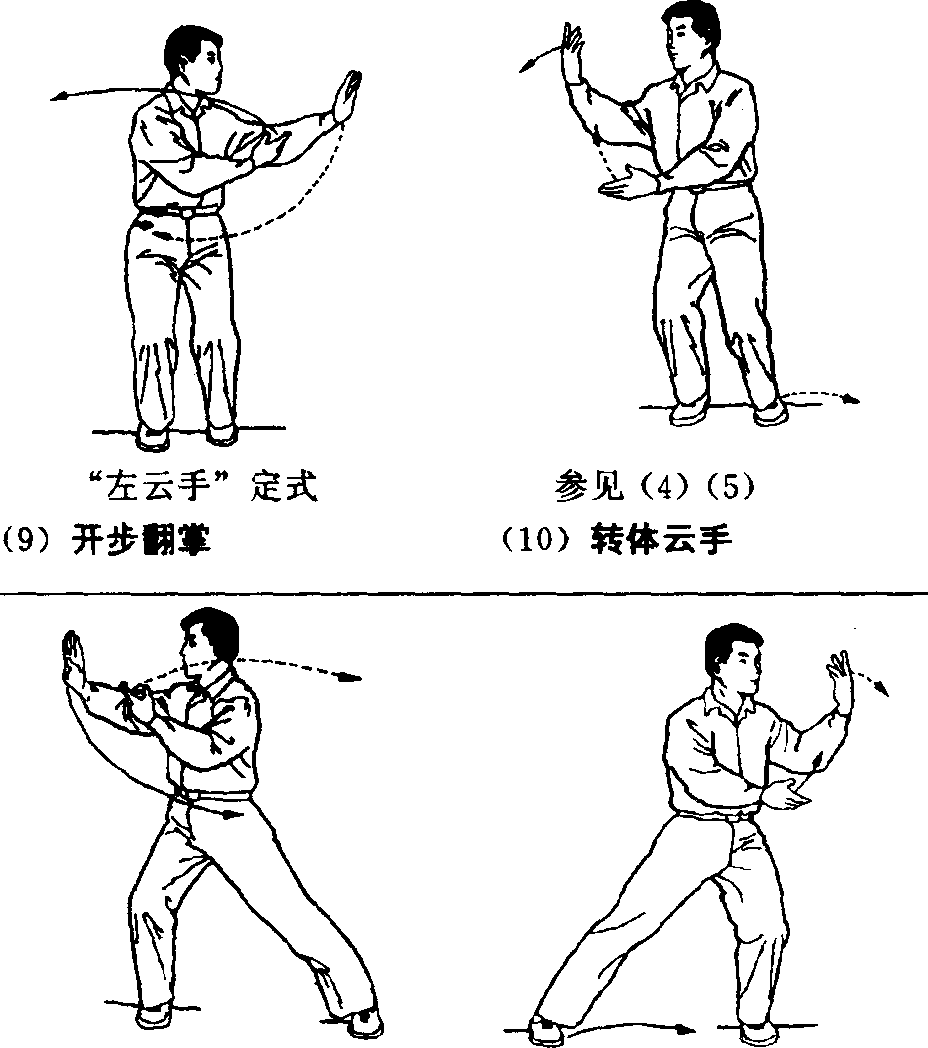 【要 点】 同右云手,唯进行方向向左。第三次收右步时,注 意内扣右脚,以便于转接下个动作。