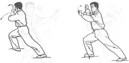 [要 点】 两手向右摆动时,头、腰都要随之转动,眼看右拳。 定式时,腰向下松沉并稍向左回旋,但右膝不要内扣,也不要向左扭胯。 头转向西南和左拳方向-致,弓步方向略偏西北。