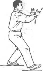 右脚落实,重心前移成右 弓步。两臂同时向前挤出,两 臂撑圆,左掌指贴近右腕,掌 心向外,指尖斜向上;右掌心 向内,指尖向左,高与肩平。 眼看右腕。