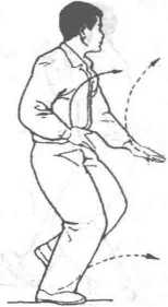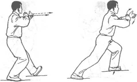 两掌在体前边翻转边上提,两手摆动不要超过身 体。上捋与收脚、前挤与弓腿要做到杪调一致。收脚时,如果初学者掌 握不好重心,脚前掌可以在支撑脚内侧点地停顿一下,然后再向前上 步。类似动作皆同样处理,不再注明。