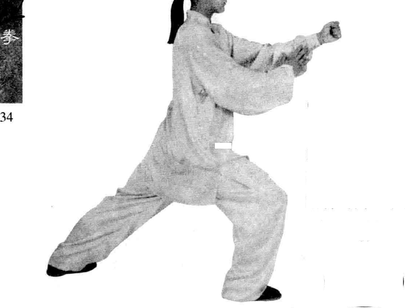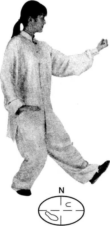 左脚向前垫步,脚跟着地, 脚尖外撇;左拳随之向前(正 东)搬出,拳心翻向上,高与胸 平,右拳经左前臂外侧顺势按 至右胯旁。眼看左拳。