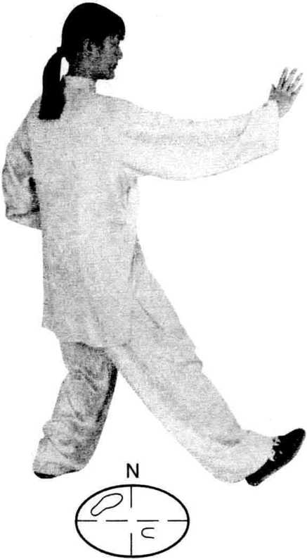 重心后移,右脚尖外展, 上体右转左掌向左前(正东) 伸展,掌心斜向下,右掌同时 向下划弧,掌心朝上。